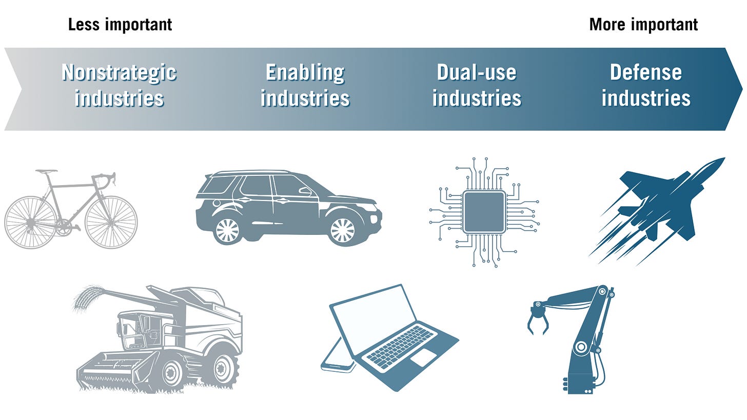But overreaction always goes astray, and it has been no different in this case. What America needs is a “third way” for trade policy that is grounded in the realization that some industries contribute more to national power and therefore matter far more than others. This can be viewed as a continuum from nonstrategic industries on one end of the scale to defense industries on the other end, with enabling and dual-use industries in the middle.